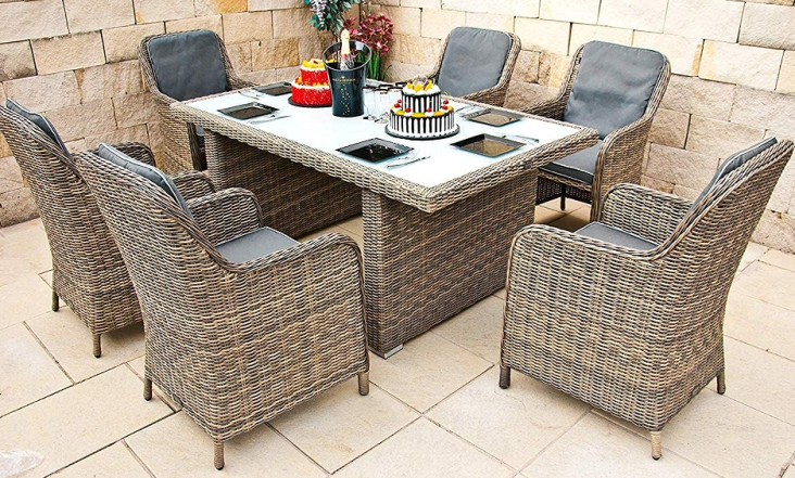 Juego de mesa de comedor «Kingchair» – Juego de comedor de alta calidad con 6 sillones y mesa de poliratán (serie Wieland)
